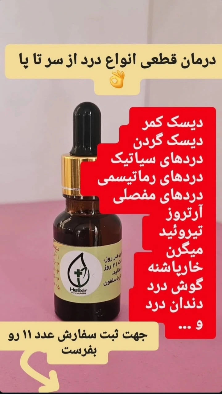 حجم : 15 میل اندازه محصول : 5*3*9 سانتی متر اصالت کالا : اصل بهبود : درد حاصل از شکستگی استخوان/انواع سر درد ها/انواع دردهای مفصلی(سیاتیک کمردرد، دردهای گردنی مشکلات شانه، آرنج، زانو) : حجم ۱۵ میل
